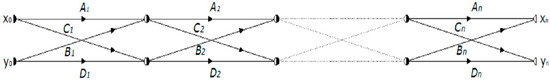 In addition, a useful feature of the POM is its practicability in special problems when the impact of a certain parameter upon others is of our interest. Taking into account the path order, the contribution of a source x0k to a sink xnL is given by the transmittance TkL of the residual graph. Which is the summation of its corresponding path values in agreement with Equation (8). These path values can be calculated directly by specifying their corresponding path sets by means of the PSD illustrated in Figure 7, i.e., by applying the POM the contribution of a source to a sink can be calculated easily without solving the entire problem.