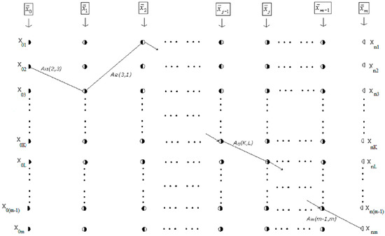 Defining a path sequence, the first path (i = 1) will start from the node x01 and will end at the node xn1, the second starts from the node x02 and ends at the node xn1, the kth will start from the node x0k till the path m is reached, which starts from the node x0m and ends at the node xn1.