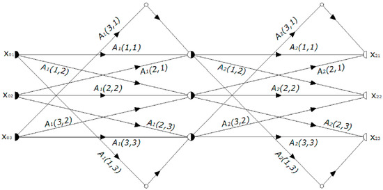 Consider an arbitrary system that is composed of two elements, each one is represented by a 3 × 3 matrix. Starting from the physical scheme of the system, the flow graph is formed by attaching side by side the graph corresponding to each element. The result is a 3 × 2 cascade graph. The cascade graph of the problem is shown the Figure 8.