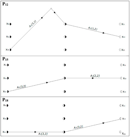 The three possible graph paths P12, P15, and P18, connecting the input node x03 to the output node x22 according to the path sets calculated by the Path Set Diagram (PSD).