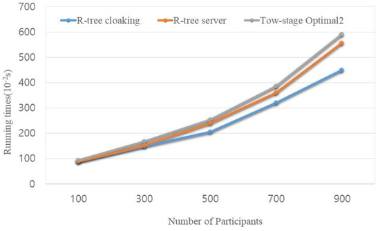 Figure 3 shows the results of our experiment. The R-tree spatial cloaking-based method performed faster than the tow-stage optimization method when the number of participants increased from 100 to 900 for 100 tasks. Because our method inserts the results into the R-tree without tree pruning, the management cost is reduced when the tow-stage optimization method inserts the results data without any data structure. When the density of MBR increased, the MBR will be separated under the stratagem of the R-tree to reduce the insertion bottle neck. Our experiment also showed that, when the number of participants was only 100, the running time for each method was similar.