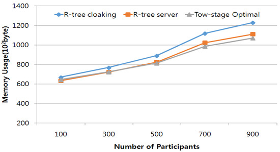 Secondly, we tested the preconstruction cost and memory usage of our proposed method. The memory usage comparison result is shown in Figure 4. In the previous running time test, we also measured the memory usage of the three methods. As Figure 4 shows, when the number of participants was same, and using the same tasks to process the crowd sourcing, the proposed R-tree cloaking method used little more memory than the traditional R-tree and tow-stage optimization methods. Because our method has to store the relation of task and subtask separately, the R-tree cloaking method has a greater cost. Although the proposed method uses almost 3% more memory than the tow-stage method, for large-scale crowdsourcing systems, real-time processing is more important than memory usage. Therefore, the proposed method is efficient for large-scale crowdsourcing systems.