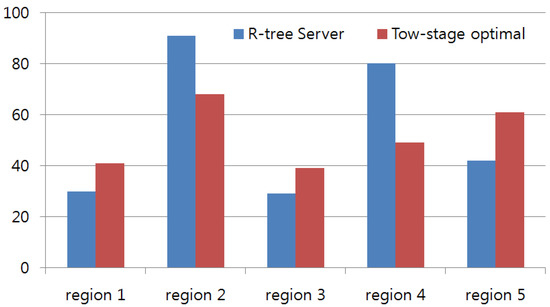 Thirdly, we tested the prevention of center-of-area attack. We compared our proposed method with the tow-stage optimization method. We used the 900 generated participants and simulated for 5 min, then we divided the test area into 16 regions. One of the separated regions was selected for center-of-area attack. We tried to evaluate the effectiveness of privacy prevention against center-of-area attack by measuring the distance between the query issuer and the center of the cloaking region. Figure 5 shows the results of three different regions. Because each test region had a different size, the distance value to the center of the cloaking region was normalized to 0–100. The proposed method and tow-stage optimization methods were both able to separate the center of the region away from the real query area; but the distance of the proposed method is more random than that of the tow-stage optimization method.