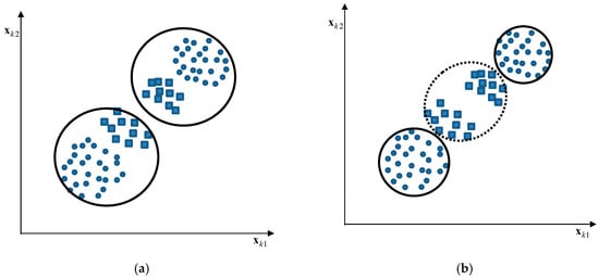 CFCM clustering [29] is an effective approach to estimating the cluster centers such that homogeneity is preserved, and is based on fuzzy granulation. To illustrate this clustering, let us briefly describe it for a simple training set as shown in Figure 1. The small circle and square of the data points reflect the corresponding values assumed by the dependent variable Figure 1a shows two evident clusters generated by the context-free fuzzy clustering algorithm. However, these clusters change when we reflect the corresponding output value. Figure 1b shows an extra cluster to preserve homogeneity with respect to the output variable. We can recognize from Figure 1 that the clusters obtained from CFCM clustering have better homogeneity than those produced by context-free fuzzy clustering.