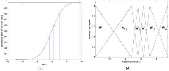 In the following, we briefly recall the essence of CFCM clustering. This clustering is realized for individual contexts by a statistical distribution in the output space. In the conventional LM as a granular model [16], these contexts are generated through a series of triangular fuzzy sets that are equally spaced along the domain of an output variable. However, it may be difficult to obtain the cluster centers in each context, because we may encounter a data scarcity problem resulting from scarce data being included in some contexts. Thus, this problem makes it difficult to obtain fuzzy rules from the CFCM clustering. Therefore, we use a probabilistic distribution for the output variables to produce flexible contexts. Figure 2 illustrates the automatic generation of linguistic contexts based on a histogram, probability density function, and conditional density function, in order [30,31]. First, we obtain a histogram from the error values. Second, we obtain a Gaussian distribution from the histogram, as shown in Figure 2b. Next, the accumulation of probabilities is performed. When p = 6, the centers of each context are located at the cumulative values [0 0.2 0.4 0.6 0.8 1], as shown in Figure 2c. Finally, the contexts with triangular fuzzy sets are generated in Figure 2d. Here, the obtained contexts are assigned a linguistic label, such as small error or large error. As shown in Figure 2, the x-axis is error obtained using the LR model mentioned in Section 2.1. These error values are used as the output data when CFCM clustering is performed.