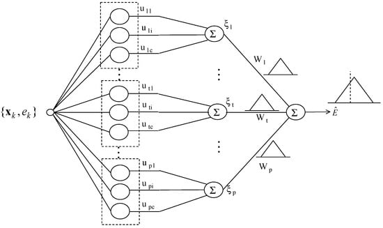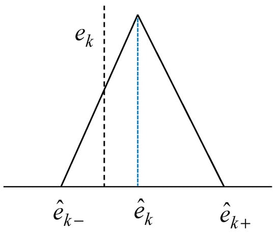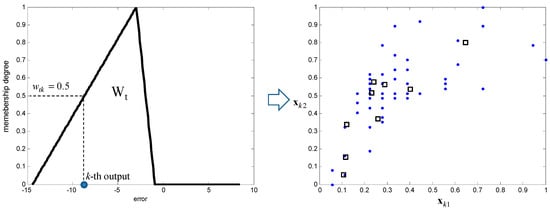 Figure 6 shows the triangular fuzzy number for the kth data point. Here, denotes the actual error for a given input . As shown in Figure 6, the predicted value is represented as triangular fuzzy number.
