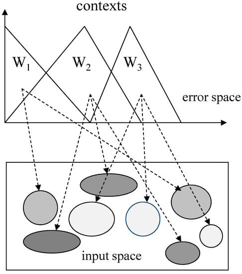 This value yields a gradual transition between the rules and identifies smooth nonlinearities of the input–output relationships of the model. Thus, this value plays an important role in the system modeling because the characteristics of the model are represented differently for different values of the cluster centers. In this paper, the weighting exponent will be optimized using GA. The computations of the cluster centers are the same as for the original FCM clustering algorithm. Moreover, the convergence conditions for this method are the same as those discussed for the original FCM clustering algorithm [29]. Figure 4 shows a detailed view of the case of three contexts and two clusters per context.