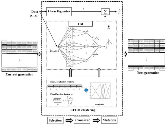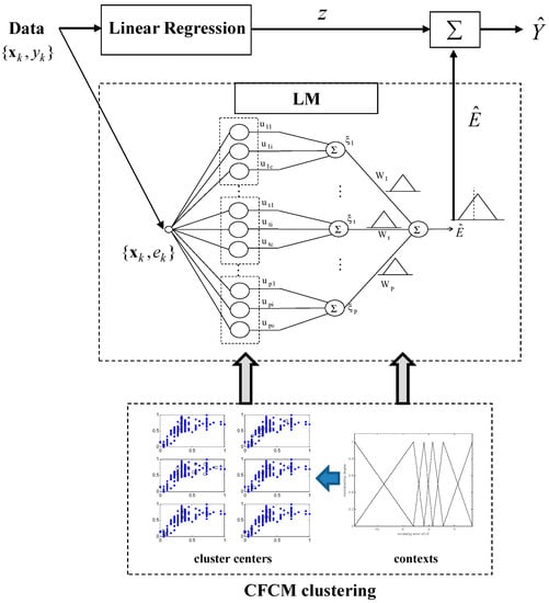 However, for problems with complex and nonlinear characteristics, both good approximation and generalization abilities have not been demonstrated. In order to solve this problem, evolutionary approaches such as GA and PSO have been adopted to optimize these models. Kwak [21,22] proposed a method for designing a genetically optimized Linguistic Model (LM) with the aid of fuzzy granulation. Several studies have been carried out on the optimization of granular models based on evolutionary approaches [23,24,25,26]. Although several studies have been conducted on the design of various models based on information granules [15,16,17,18,19,20], a method to predict for modeling errors has not been considered. In order to predict modeling errors, Pedrycz [27] proposed an Incremental Granular Model (IGM) based on the combination of linear regression (LR) as a global model and the LM as a local granular model. First, after designing an LR, the modeling error obtained by the LR was predicted by the LM using local fuzzy if-then rules to capture the remaining localized nonlinearities of the system. Li [28] proposed a concept of incremental fuzzy models in which fuzzy rules aim to compensate for discrepancies resulting from the use of a certain global—yet simple—model of a general nature. However, this method encounters the problem that the number of cluster centers in each context is equal, although the properties and size of the data in each context differ. Furthermore, a weighting exponent is set to a common fixed value, although this design parameter exhibits a significant impact on the character of nonlinearity being developed.