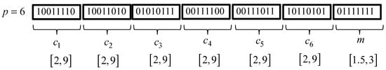 In the encoding scheme, we transform the cluster number and the weighting exponent in the parameter space into bit string representations. Figure 8 shows a representation of the encoding scheme for the cluster number and weighting exponent when the bit number is 8. For example, in the case of , these parameters can be represented by a concatenated binary string. Here, each coordinate value is encoded as a gene composed of eight bits using binary coding. As shown in Figure 8, the last row represents the ranges of the number of clusters and the weighting exponent to be optimized, respectively.