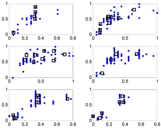 Figure 10 shows the contexts obtained from the error space when the number of contexts is from five to eight. Here, the error values are residuals obtained from the LR model. Figure 11 illustrates the distribution of data and cluster centers generated in six contexts after performing GA. These clusters build information granules in the form of fuzzy sets, and are used to produce fuzzy if-then rules. Figure 12 illustrates the performance of parallel GA across generations. Here, we finally obtained the best parameters (number of clusters: c = [3, 9, 4, 5, 9, 7, 6], weighting exponent: m = 1.9285) when the number of linguistic contexts is seven (p = 7). As shown in Figure 12, we determine the best case of the fitness value across 30 generations when the number of contexts varies from five to eight. In order to obtain the best model, we used the elitism scheme so that the solution quality obtained by the GA will not decrease from one generation to the next. The best curve is monotonically increasing with respect to the generation numbers, because we used elitism scheme to keep the best two individuals from each generation. Table 1 lists the parameters optimized by the GA for the coagulant dosing process example.