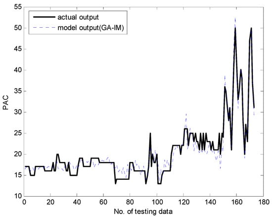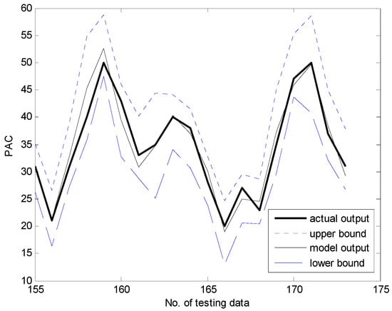 Figure 13 and Figure 14 present a comparison between the desired and model output for the training data and checking data, respectively. As shown in these figures, it is obvious that the proposed GA-based IGM approach achieved good approximation and generalization performance. In particular, it can be seen that the output data with strong nonlinearity is well predicted. Figure 15 illustrates the interval prediction performance represented by the lower bound, modal output, and upper bound for part of the testing data set. The interval prediction is generated by a triangular fuzzy number from the LM, forming a specific model output. Figure 16 shows the error prediction obtained from the local LM. In particular, it was found that the data with large errors was well predicted. As a result, the error prediction can compensate the residuals obtained from LR as a first-principle global model. Table 2 lists the comparison results of the RMSE for the training and testing data for the coagulant dosing process. These experiments were performed in the computer environment of and Intel Core i7-4790 CPU with MATLAB R2015A. The processing time of the IGM is 0.06 s (p = c = 6), while the average processing time of the proposed GA-based IGM is 2.06 s for one generation. In the case of 30 generations, the processing time of the GA-based IGM is 69.91 s. On the other hand, the processing time of the LM is 0.09 s (p = c = 6), while the average processing time of the proposed GA-based LM is 5.1 s for one generation. In the case of 30 generations, the processing time of GA-based LM is 153.04 s. As listed in Table 2, the experimental results revealed that the proposed GA-based IGM achieved good performance in comparison with previous methods such as LR, MLP, CFCM-RBFNN, LM, GA-based LM, and IGM itself. Here the proposed GA-based IGM achieved the best performance in terms of the generalization capability when the number of contexts and fuzzy rules are 7 and 43, respectively. The GA-based IGM obviously outperformed the conventional IGM. Moreover, it was found from the results that the GA-based IGM obtained the optimal fuzzy if-then rules and weighting exponent, in contrast to the method by trial and error.