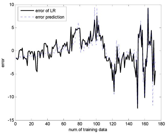 - Perform prediction using LR for the original input–output data pairs. Then, we obtain the modeling errors between the actual output and the model output of LR. From the original data set, a collection of input-error pairs is obtained.