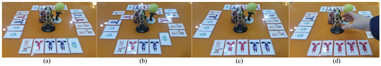 The flow of the proposed interactive content: (a) start the content; (b) select cards; (c) result of card exchange; (d) card game finish condition and event after finish.