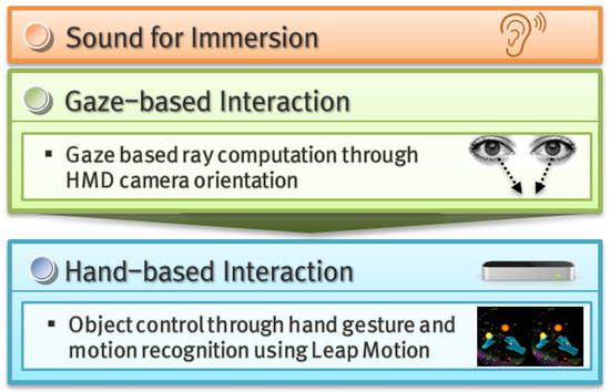 Section 2 analyzes various input processing techniques and the psychological factors of users that are required to develop contents based on virtual reality. Section 3 describes the production process for immersive 3D interactive contents proposed in this study. Section 4 describes the core technique of hand interaction using gaze and Leap Motion in this study. Section 5 describes the experiment and analysis process for the proposed method. Finally, Section 6 outlines the conclusion and presents future research directions.