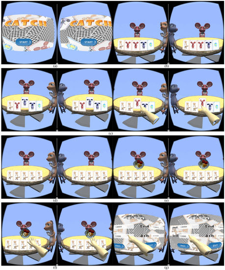 The experimental process consists of checking the production result of the proposed content and the analysis of the physical and psychological effects of the gaze-based hand interaction of this study on users in the virtual reality environment. First, the virtual reality content of the mobile platform was produced in accordance with the plan, and the accurate operation of the interaction process was verified based on the proposed input processing. When the content is started, the main screen is switched to the content screen. On the content screen, four characters (including the user) are deployed in the virtual space, five cards are randomly distributed to each character, and the process of selecting the last finish object by matching the cards of one type is implemented. In this process, an interaction method was designed by which the user selects cards using his/her hands based on his/her gaze and touch of the last virtual object. Figure 6 shows this process, and the progress of accurate interaction can be checked in the smooth flow of the proposed interactive content.