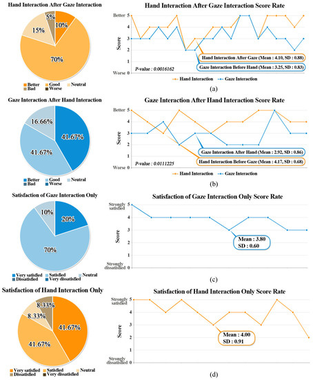 Figure 8 shows the results of the four experimental groups. First, 80% of the participants who experienced the interactions in the order of G and H replied that the hand interaction was more satisfactory. Their satisfaction scores showed an average difference of 0.85 between G and H (Figure 8a). Figure 8b shows the results of the experimental group who experienced the interactions in the reverse order, and 83.34% of the experimental group was more satisfied with the gaze-based hand interaction. Their satisfaction score difference between G and H was 1.25. There was a slight difference in satisfaction depending on which interaction was experienced first between the gaze and the hand. In particular, participants who experienced the hand interaction first were more satisfied with the gaze-based hand interaction than with the gaze interaction only.