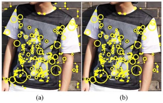 Example of the feature points in an image: (a) feature points using only SIFT; and (b) the feature points using feature selection.