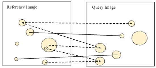 A matching pair ( is composed with two feature points matched in two images. In other words,  consists of the respective feature points from the reference and query images. In Equation (3),  represents the respective positions of two feature points. Here, , where  is the position of the feature point extracted from the reference image, and  is the position of the feature point extracted from the query image. When the th matching pair  and th matching pair  are compared, if  matches , or  matches , they are determined to be overlapped, and the number one is assigned to . With this equation, one or zero is assigned to every , and finally, an overlap matrix of size NM × NM with  for all  as its elements is generated. In Figure 3, the circles mean the feature points and lines mean the matching pairs. In addition, dotted lines are overlapped matching pairs and the solid-lines are non-overlapped matching pairs. The generated overlap matrix is used in the clustering process.