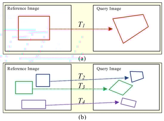 Figure 4a presents two images with rigid objects, one of which has one transform matrix (T1). The reference image’s rigid object is transformed geometrically to T1 in the query image. On the other hand, Figure 4b shows two images with deformable objects, and has many transform matrices (T2, T3, and T4). In this case, a deformable object of the reference image is transformed geometrically to T2, T3, and T4, in the query image. Therefore, because a deformable object cannot be defined with one transform matrix, a new method is required for the approach by generating many transform matrices in a small region. One method used here is to make a symmetric similarity matrix. The symmetric similarity matrix consists of the similarity between transform matrices composed in a point unit. In other words, a symmetric similarity matrix is composed of geometric similarity between all matching pairs.