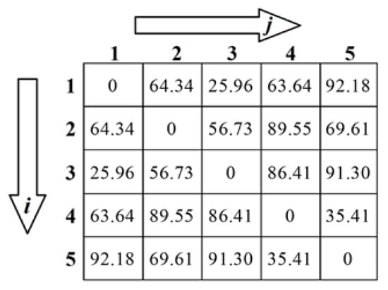 The two matching pairs to be compared are given as ) and ).  denotes the Euclidean distance, and  is small if  and  are similar. If geometric similarity is obtained between every matching pair, a symmetric similarity matrix of size NM × NM with  as the element is composed, as shown in Figure 5. The symmetric similarity matrix has zero diagonal elements.