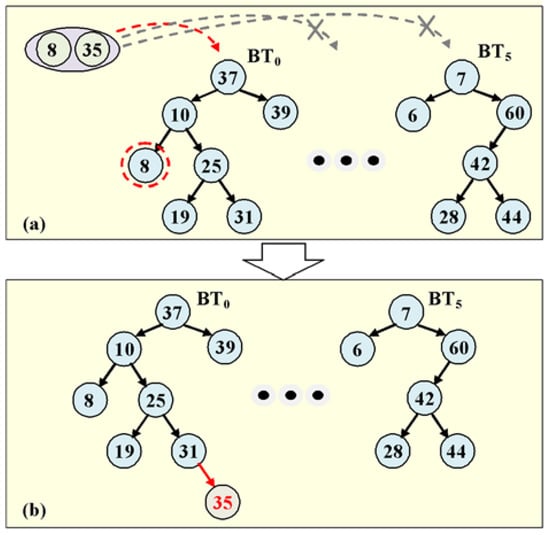 In the next part, searching and inserting  and  is performed using BST. This process is performed the maximum of Ntree times, and if a node is searched at least once in BTt, it is terminated. In total, there are three cases of nodes searched from BTt. The first is the case where both  and  are searched. Here, because all pertinent nodes exist, the process is terminated without insertion. Next is a case where only  is searched. Here,  is inserted as a new leaf node in BTt, and the process is terminated. Finally, in the case where only  is searched,  is inserted as a new leaf node, and the process is terminated. Figure 6 gives an example of the searching and inserting process of BTt. For example, when the = 8 and  = 35, Figure 6a shows that the node 8 of BT0 is searched. This is the case where  is searched. As shown in Figure 6b,  = 35 is inserted as a new leaf node in BT0 because  is not searched in BT0.