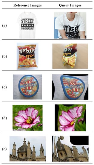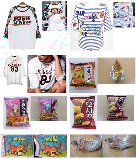 A representative technology that uses image recognition is content-based image retrieval, which was established as the MPEG-7 standard. Recently, at MPEG-7, by constructing the CDVS (Compact Descriptor Visual Search) [], a study was performed for content-based image retrieval, which retrieves an image fast for mobile devices. Content-based image retrieval is a technology that retrieves an image by extracting robust features even if various deformations in brightness, rotation, affine, and size, occur in the image. On the other hand, most matching algorithms perform retrieval by targeting images with rigid objects [,,]. The object types also include deformable objects; typical examples include clothes, packs, and bags. For rigid objects, the object shapes do not change, but for deformable objects, the object shapes can change in various ways. Because of this difference, the conventional rigid object matching algorithms that are robust to images with rigid objects are not suitable for matching images with deformable objects. Therefore, developing a matching algorithm that is robust to images that contain deformable objects has become an important issue.