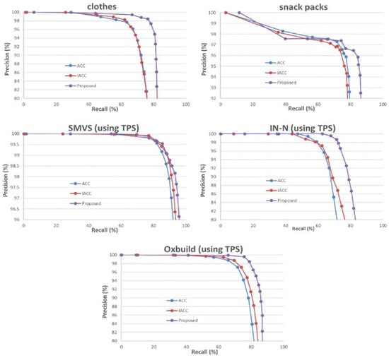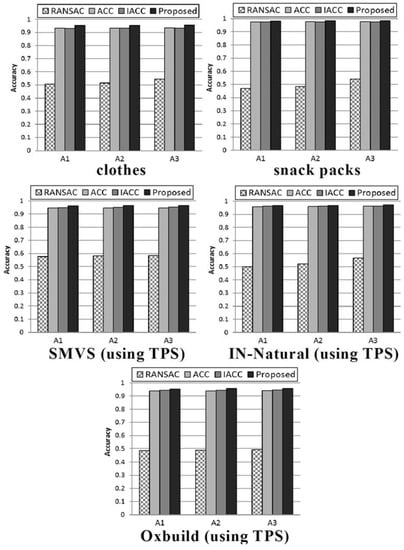 Figure 9 presents the top three values of accuracy (A1, A2, A3) for each algorithm using Equation (9). These are the results of experimenting with the image set of clothes, snack packs, SMVS (using TPS), IN-N (using TPS) and Oxbuild (using TPS). In the case of RANSAC, the accuracies were very low because it is not an algorithm suitable for images with deformable objects. The other algorithms showed better performance with the proposed algorithm showing the best performance. Figure 10 presents the recall vs. precision curve using similarity threshold () in each image set. The proposed algorithm outperformed the other algorithms, especially for high recall values.