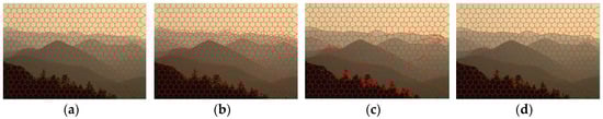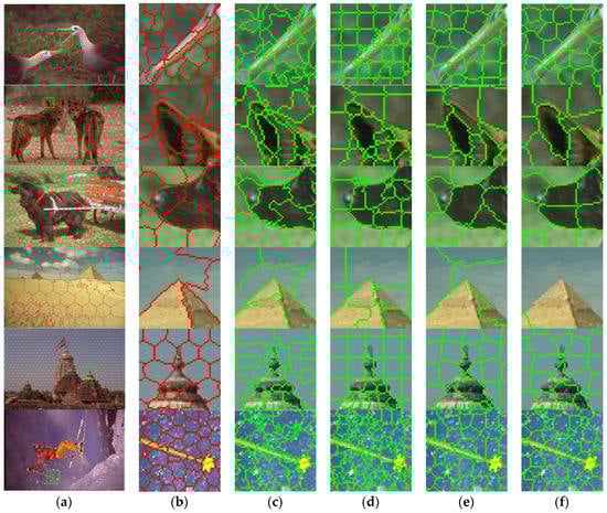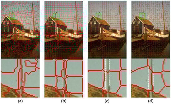 The iterating process of BSLIC is displayed in Figure 9. Figure 9a shows the superpixels with only plane centers initialized, in which the superpixels have good axial symmetry in both the horizontal and vertical directions. Figure 9b is the superpixels with edge centers initialized. It is obvious that the axial symmetry of the edge-cross superpixels is destroyed. Figure 9c,d are the first and final iterating results. Compared to the final results, the first iteration has already aligned to the true boundaries in the whole picture.