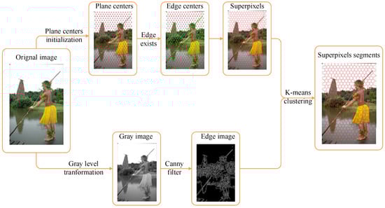 Although superpixels were firstly described as over-segmentations by Ren and Malik in 2003, they have still not been exactly defined [1,2]. Generally, a superpixel can be treated as the set of pixels that are similar in location, color, texture, etc. Superpixels can capture image redundancy and transform pixel-level computing into a region-level operation [3], which can greatly reduce the complexity of subsequent image processing tasks. Superpixel segmentation has become an important pre-processing step in various image processing applications, such as image segmentation [4,5,6,7,8,9], saliency detection [10,11,12] and classification [13,14].