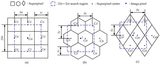 SLIC performs k-means clustering within the local region of pixels. For a square distribution, there are at most nine adjacent superpixels within the local region. Pixel in Figure 3a depicts this. The local searching region of is marked by the rectangle in the blue dotted line, there exist nine adjacent superpixels (, , , , , , , and ) in the scope. This means that, at most, nine distance calculations are needed for the assignment of one pixel. The complexity for each iteration of the clustering is 9. Compared with square distribution, the hexagon distribution has a lower complexity of 6 for one iteration of the clustering. As shown in Figure 3b, there are six adjacent superpixels (, , , , and ) in the local searching scope of pixel . The complexity of the diamond distribution is also 6, which is displayed in Figure 3c.