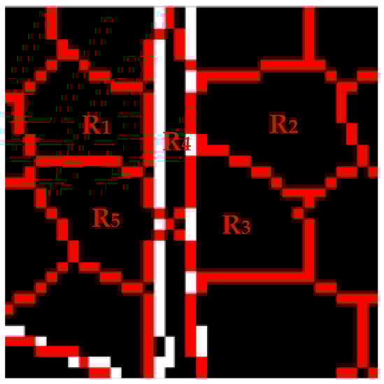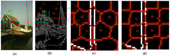 Superpixel segmentation results with initialized edge centers are displayed in Figure 6. Compared with Figure 4c, the edge-across superpixel is successfully transformed into the accurate superpixel in Figure 6a, which can improve boundary adherence to some degree. However, when it comes to square distribution, there is no apparent decrease in area for edge-across superpixels and , as shown in Figure 4d and Figure 6b.