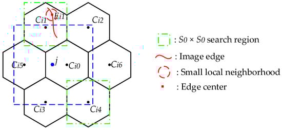 Figure 3b displays the geometric sketch of a hexagon distribution. Centers , , , , , and are sampled at intervals of pixels in the horizontal direction, and pixels in the vertical direction. Hexagons in the black solid line are superpixels. To make the hexagon superpixel equal to the square superpixel in area, side lengths of the square and hexagon should follow the mathematical relationship: