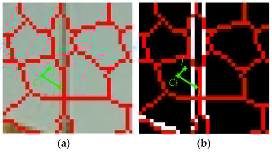 Boundary term incorporation. (a) Partial enlarged superpixels on original image; (b) Partial enlarged superpixels on logical edge image.