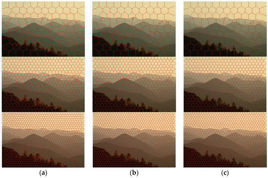 BSLIC superpixels segmentation results. Superpixels number , weighting factor . (a) BSLIC segments when ; Column (b) BSLIC segments when ; Column (c) BSLIC segments when .
