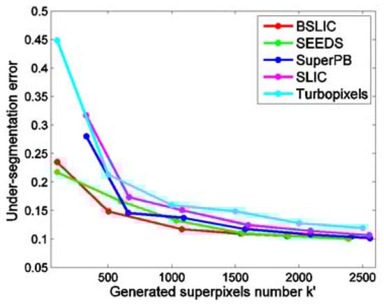 We compare BSLIC with four other methods: SEEDS, SuperPB, SLIC and Turbopixels. All the 500 images of dataset BSDS500 are segmented by these five methods. As the superpixels are segmented to give a description of features for a subsequent image processing task, they cannot be too small in size. Herein, we maintain the size of a superpixel larger than 80, which is nearly in size. For images in resolution, when the number of superpixels exceeds 2000, the generated superpixels are approximately an average size of 77. Therefore, during the experiments, takes its value at intervals of 100 from 50 to 2500. Weighting factor is within the range of .