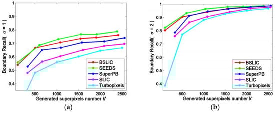 As the rounding operation is done when calculating the horizontal and vertical intervals, and the initialized centers are updated as the lowest gradient position in a corresponding local neighborhood, the numbers of actually generated superpixels are not equal to . Figure 13 displays the UE curves against . Obviously, BSLIC has lower UE than in the other methods. According to the obtained UE, the boundary adherence can be sorted from high to low as: BSLIC > SEEDS > SuperPB > SLIC > Turbopixels. Figure 14a,b displays the BR curves with radius of neighborhood respectively. It is observed that BSLIC produces a uniform increase for BR when compared with SuperPB, SLIC and Turbopixels. BSLIC is a little bit inferior to SEEDS in boundary recall. However, BSLIC has apparent advantages over SEEDS in the regularity and compactness in size and shape.