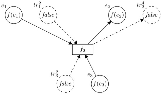 Each element of the considered system is represented by a place (so-called component place). The type (colour) of the place is the set V. Each marking of the place contains only one token that represents the value . Moreover, one or more so-called trigger places may be attached to each component place— denotes the trigger place of the component place assigned to function . Trigger places will be distinguished with dashed lines. Each marking of a trigger place contains only one token of type Bool (Boolean). For a trigger place , the value True denotes that the value of the function changed and should be propagated to other component places. Due to the fact that only two types are used in a propagation net (V and Bool), we omit the type labels in the net figure, instead of type labels solid and dashed lines being used. Thus, only two labels are attached to each place: the place name and its current marking.