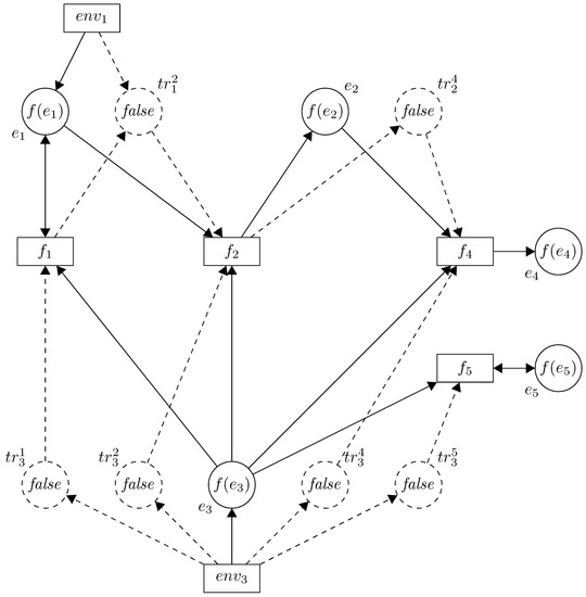Suppose the value depends on values of the function f for some components . Thus, if the value for a component , changes, the change must be propagated to . In the presented approach, such an internal dependency is represented by a function , i.e., . The set of internal dependencies takes the form of the set F of functions that represents dependencies between values of the function f on the system components, including hierarchic and isomorphic relation among those elements. The set F is treated as the input data for the algorithm of construction of a propagation net.