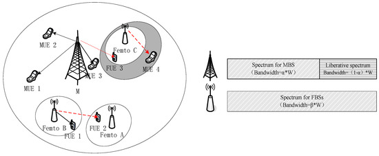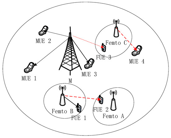 With the constant evolution of cellular mobile communication systems, traditional cellular monolayer networks have failed to satisfy the requirement of transmission speed, and are beset by such issues as imperfect indoor coverage effect and insufficient capacity for outdoor hotspot areas [1]. Hence, the heterogeneous network (HetNet) has become a key technology for the next generation of communication networks. Given that over 70% mobile data is produced indoors at present [2,3], the femtocell can effectively solve relevant issues about indoor communication due to its flexibility of deployment. Therefore, deploying femtocells in current macro-cellular networks to form macro-femto bilayer HetNet can transfer the load of the macro base station to femtocells, thus improving system performance. However, the introduction of femtocells will bring cross-layer interference between macro base stations and femtocells. The macro users located around femtocells tend to be highly subject to the strong interference of femtocells, thereby lowering the overall performance of system, especially the throughput [4]. In order to solve the above problems within academia, there are some cases using resources allocation method.