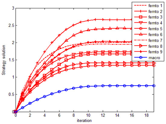 Finally, solve the femtocell strategy according to Formula (23), until the solved strategy meets the accuracy requirement.