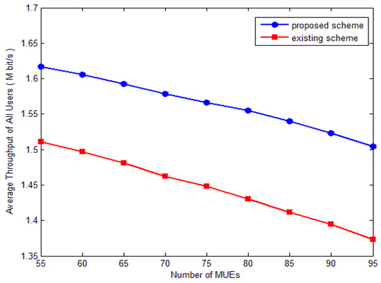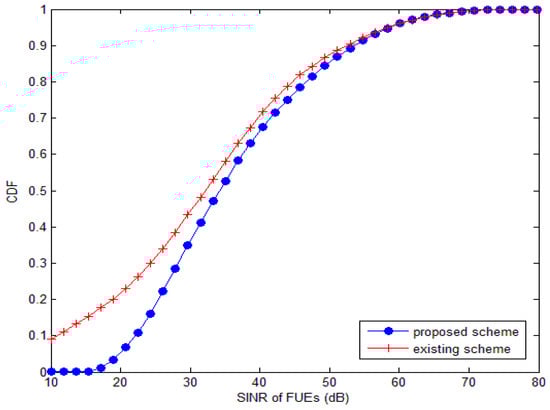 Figure 6 and Figure 7 show the performance of the proposed scheme and the existing scheme. The existing scheme is the one introduced by the reference [29]. Figure 6 shows the femto users’ (FUEs’) cumulative distribution function (CDF) of the SINR. It obviously shows that the femto users’ SINR performance is better. It is because the existing scheme made improvements by defining the utility function as average throughput capacity of the macro base station and standard distortion rate of femtocells, respectively. However, each base station in HetNet was assumed as an independent individual in the game model, which attempted to seek the maximal energy efficiency without considering the feelings of other individuals in the network or the overall performance of the system. The definition method of the utility function is improved in our algorithm. The proposed scheme considers the overall performance of the system and improves the performance of the system. Moreover, the proposed algorithm especially improves the average throughput of the users when the users’ SINR is low. The proportion of users who have a lower SINR is lower. The proportion of users with less than 20 dB is only 0.05.