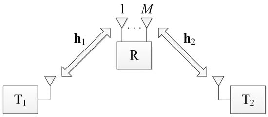 Many works in the literature (e.g., [,,,,]) have been devoted to two-way multi-antenna relaying (without SWIPT) as this approach can not only extend communication range but also improve spectral efficiency. In a basic two-way multi-antenna relay network (see Figure 1), an intermediate relay node equipped with multiple antennas is used to assist two end nodes in exchanging their information. Nevertheless, application of SWIPT to this kind of network is still in its infancy [,,]. In [], the SWIPT-based beamforming design for a multi-antenna relay was considered to maximize the sum rate of its two-way relay network. In [], the authors presented a three-phase two-way relay network where an energy-constrained multi-antenna relay node harvests energy from a pair of single-antenna source nodes, and presented an optimal power allocation solution. In [], an optimal joint source and relay beamforming scheme for two-way multi-antenna relay networks with SWIPT was proposed based on the principle of singular value decomposition.