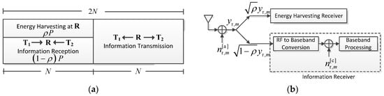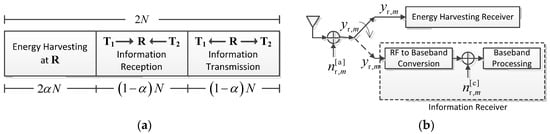 where is the energy conversion efficiency (which depends on the rectification process and the energy harvesting circuitry []). Meanwhile, the information receiver in Figure 2b down-converts the RF signal to baseband and processes the baseband signal, where is the AWGN due to RF-band-to-baseband signal conversion. After down conversion, the sampled baseband signal vector at the relay node is given by: