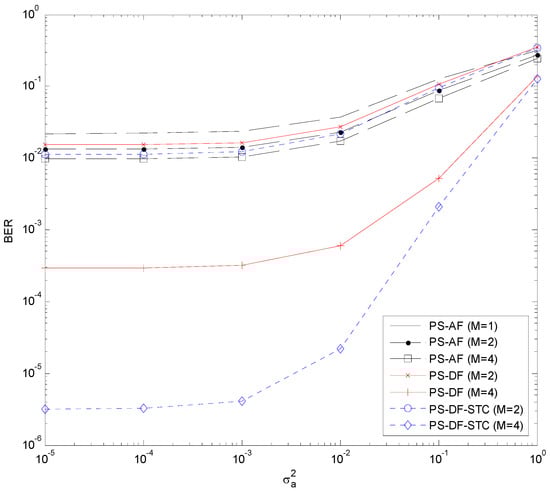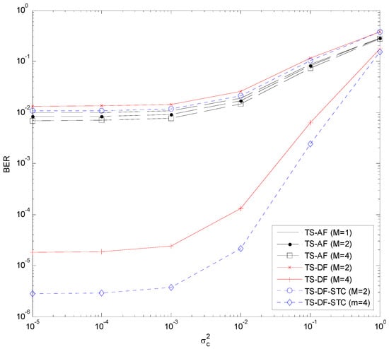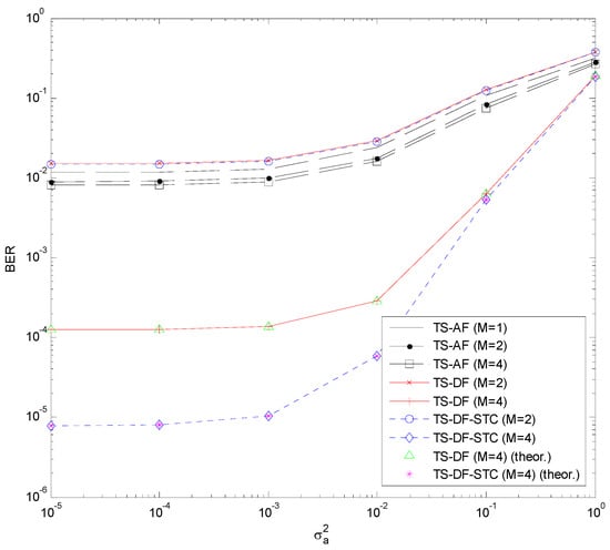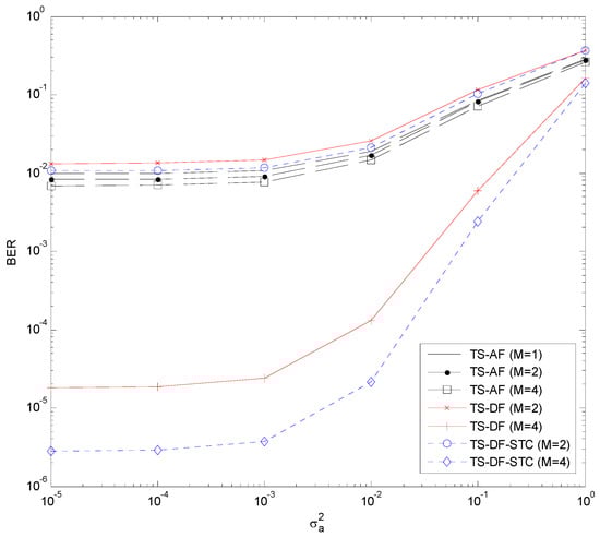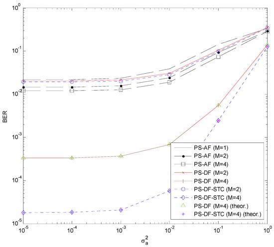 The simulated BERs of the PS-DF, PS-DF-STC, and PS-AF schemes are plotted versus antenna noise variance for different numbers of relay antennas (with fixed conversion noise variance ) in Figure 4 and versus conversion noise variance for different values of (with fixed antenna noise variance ) in Figure 5. The theoretical BER curves of the PS-DF scheme (computed with Equations (9), (16), and (17)) and the PS-DF-STC scheme (computed with Equations (9), (17), and (24)) are also included and labeled with “(theor.)”. We can see that the theoretical results perfectly match their simulation counterparts, which verifies the BER formulae derived in Section 3.1 and Section 3.2. Similarly, the results for the TS-DF, TS-DF-STC, and TS-AF cases are shown in Figure 6 and Figure 7. As seen, the theoretical BER results (computed with Equations (17), (34), and (38) for the TS-DF case, and with Equations (17), (34), and (41) for the TS-DF-STC case) agree well with the simulated ones, which validates the BER analysis in Section 4.1 and Section 4.2. It is clear that increasing the number of relay antennas generally improves the BER performance (the results at are excluded to make the BER curves readable in all these figures). From Figure 4 and Figure 5, we can see that the BERs of the PS-DF, PS-DF-STC, and PS-AF schemes are comparable when , and their difference becomes significant when . In the latter case, the PS-DF-STC scheme performs best while the PS-AF scheme does worst. Similar performance trends can be observed in the TS-DF, TS-DF-STC, and TS-AF schemes, as illustrated in Figure 6 and Figure 7. Comparing Figure 4 and Figure 6 (or Figure 5 and Figure 7), one can find that, with the same number of relay antennas, the TS-DF and TS-AF schemes are generally superior to the PS-DF and PS-AF schemes, respectively.