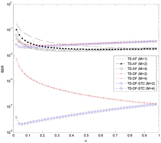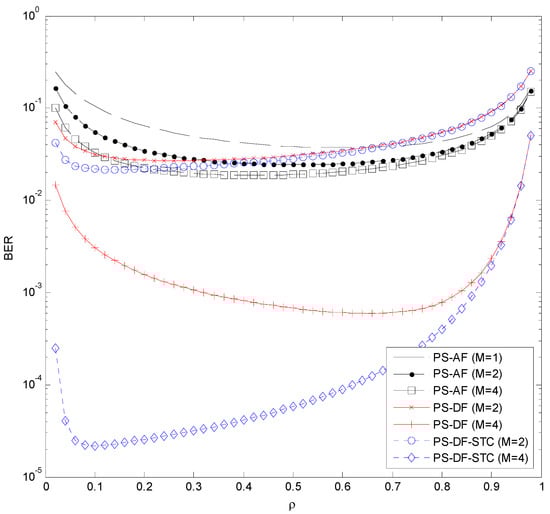 It would be interesting to study the effect of the power allocation parameters, i.e., power splitting ratio and energy harvesting time , on the BER performance. To this end, we show in Figure 8 the BER as a function of for the PS-DF, PS-DF-STC, and PS-AF schemes, and in Figure 9 the BER as a function of for the TS-DF, TS-DF-STC, and TS-AF schemes. From these two figures, we observe that, in general, equal power allocation, i.e., , is a good strategy for the PS-AF and TS-AF schemes. However, the optimal and which minimize the BERs of the PS-DF and TS-DF schemes, respectively, depend mainly on the number of relay antennas . Specifically, these optimal and increase (toward ) as increases. For example, the optimal for the two-antenna PS-DF scheme is approximately 0.26 while that for the four-antenna PS-DF scheme is around 0.65 (See Figure 8). In addition, the optimal for the two-antenna PS-DF-STC scheme (or the optimal for the two-antenna TS-DF-STC scheme) is nearly the same as that for the four-antenna PS-DF-STC scheme (or that for the four-antenna TS-DF-STC scheme). This result indicates that these optimal and are not sensitive to the value of , unlike those for the PS-DF and TS-DF schemes, respectively.