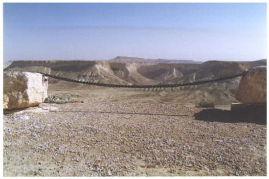 A chain hanging in a catenary form against the background of the Tzin Valley in central part of the Israeli Negev.