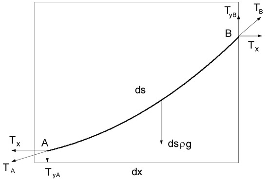 - Fallis, M.C. Hanging shapes of nonuniform cables. Am. J. Phys. 1997, 65, 117–122. [Google Scholar] [CrossRef]