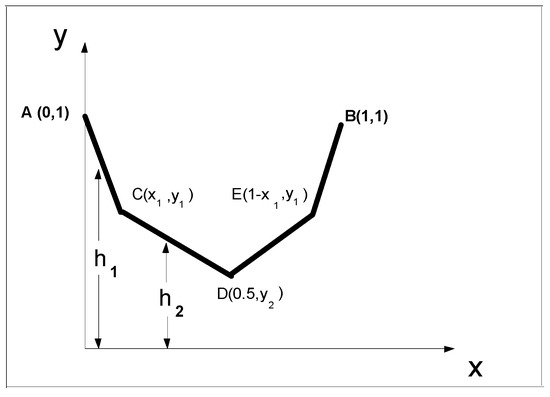 Schematic illustration of the four-segment chain. Consider a uniform chain () which is suspended between two same level points and . Find points and that minimize the potential energy of the chain (Figure 8).