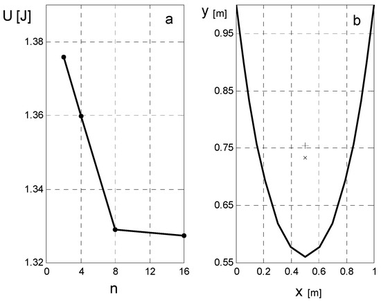(a) The total potential energy of the chain (in Joules) for a chain with and for for the different stages of the approximations; and (b) the 16-line chain. The cross mark indicates the center of mass, whereas the plus mark is the location of the center of mass for .
