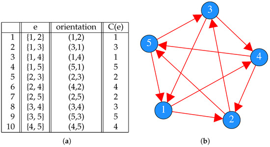 In considering possible analogues to Figure 1b, summarizing domination, one might include a directed edge from vertex v to vertex w, if and only if, for edges that include both v and w, the tally of wins for v exceeds that of w. The resulting graph is depicted in Figure 2b. Note that there is a directed edge from vertex 1 to vertex 2, since vertex 1 is chosen for edge , while there is no edge, e, where vertex 2 is chosen when . It may be noted that in this case the associated graph is path connected.